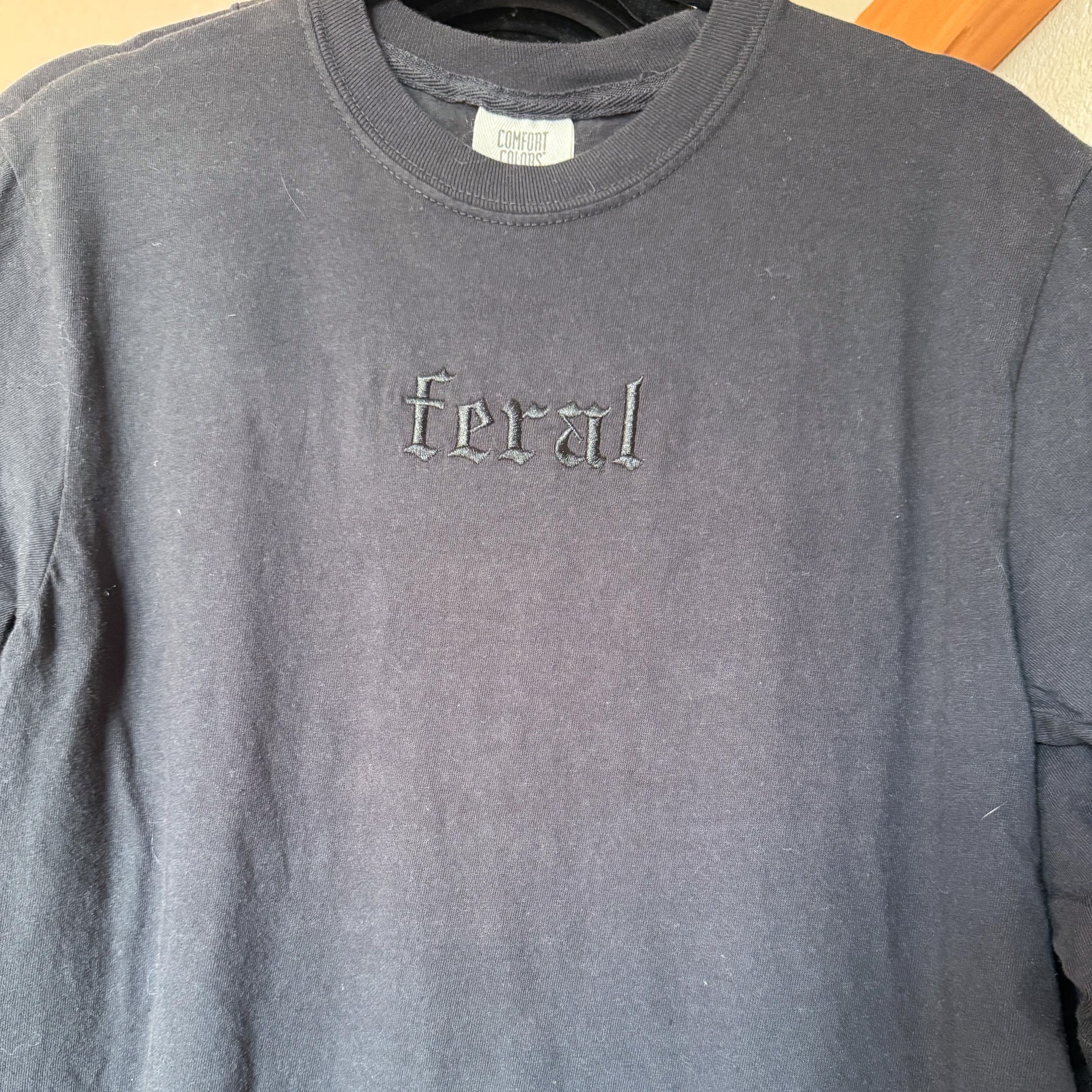 Add a touch of old school style to your wardrobe with the Feral Tee. The embroidered olde English font adds a unique twist to this monochromatic tee. Stand out from the crowd with this fun and quirky shirt.