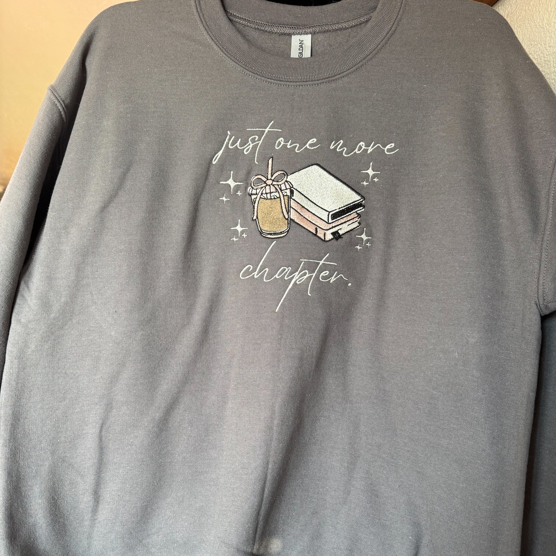 Embrace your love for books in style with our Just One More Chapter Crewneck. Featuring a playful embroidered design, this cozy coquette top is perfect for book lovers who just can't put their favorite reads down. (Oh, the irony!) Get ready for endless compliments and cozy comfort. Happy reading!