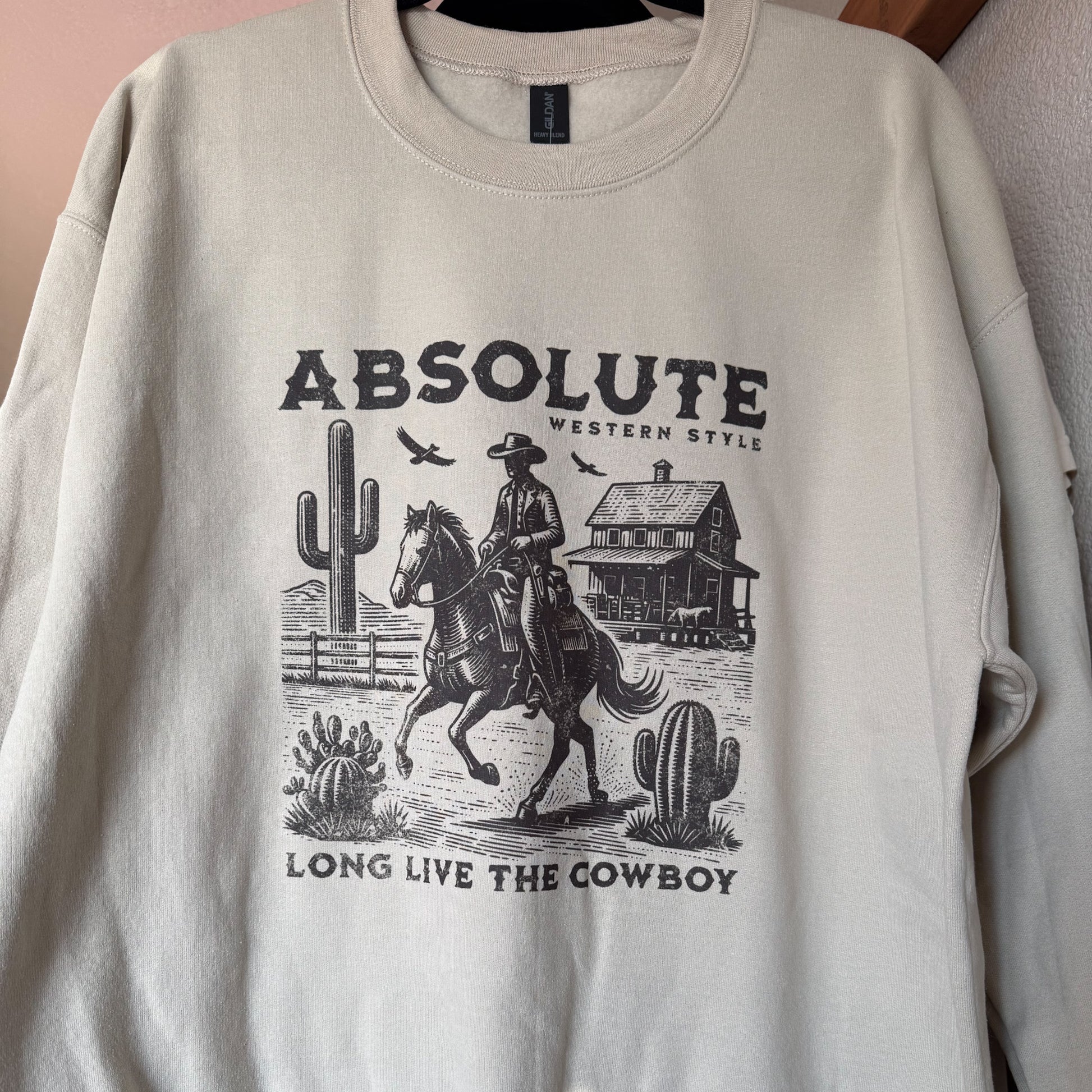 Ride into style with our Long Live the Cowboy Crewneck. This western-inspired crewneck will have you looking rugged and ready for any adventure. Don't be a city slicker, embrace your inner cowboy with this unique and playful piece. Yeehaw!