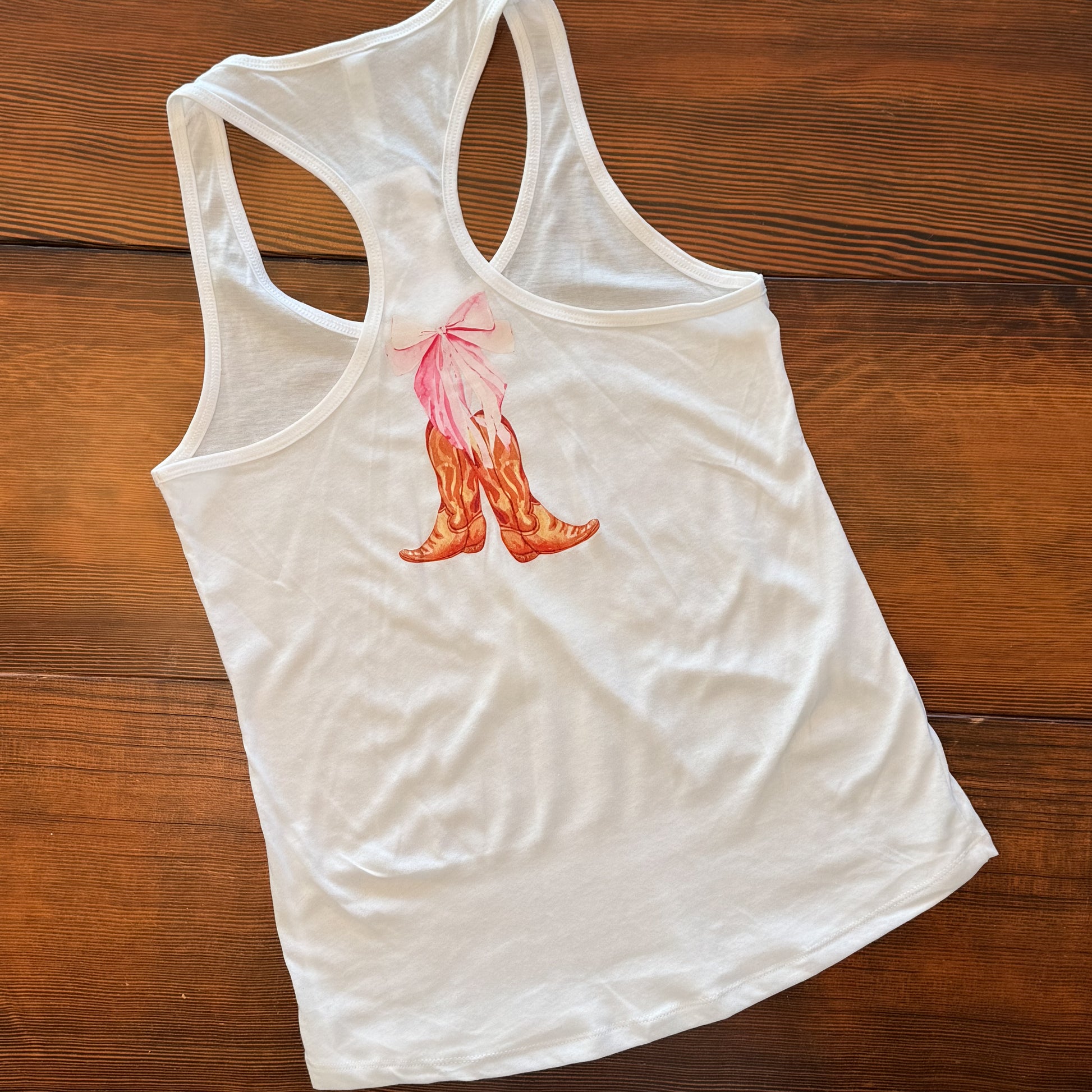 Be a boss babe in the Miss Never Do No Wrong Tank! This razorback tank features coquette bows and cowgirl boots, making it perfect for the girl who's always right. Stay stylish and confident in this playful and quirky tank.