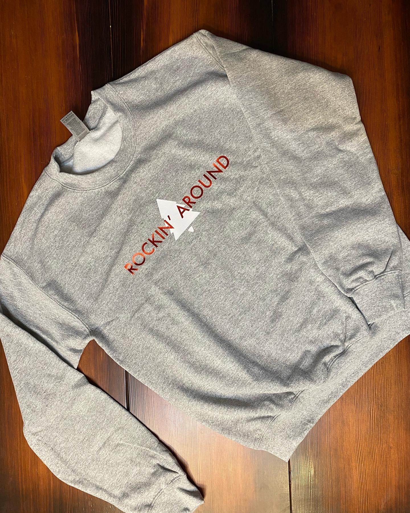 Grey heavy weight crewneck, with metallic red HTV vinyl and white HTV vinyl Christmas tree.
